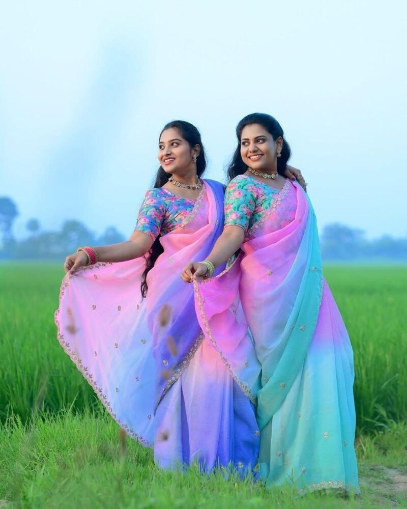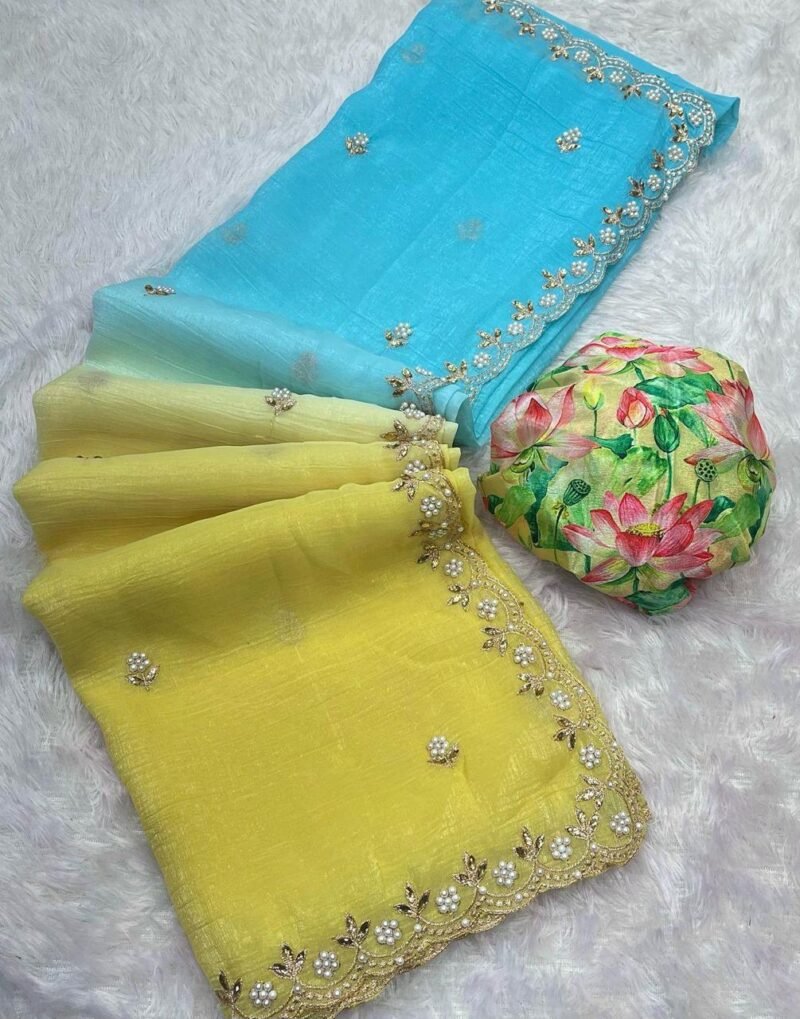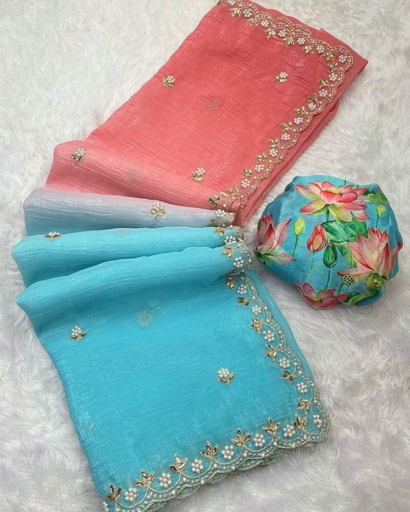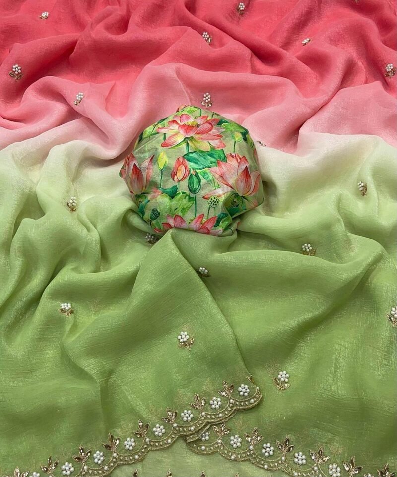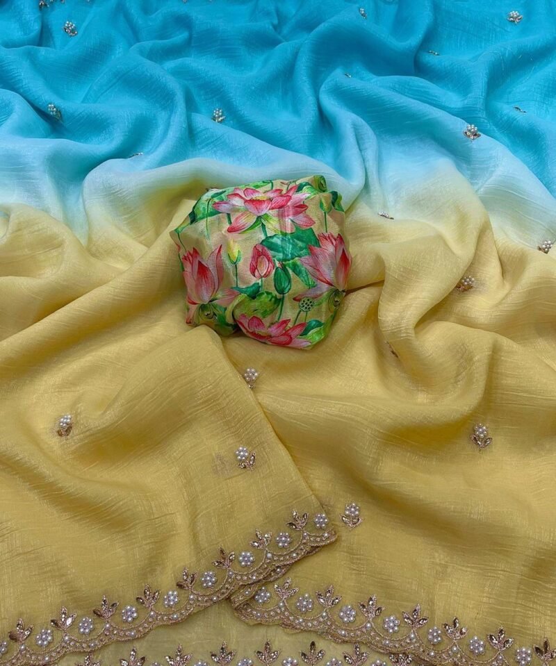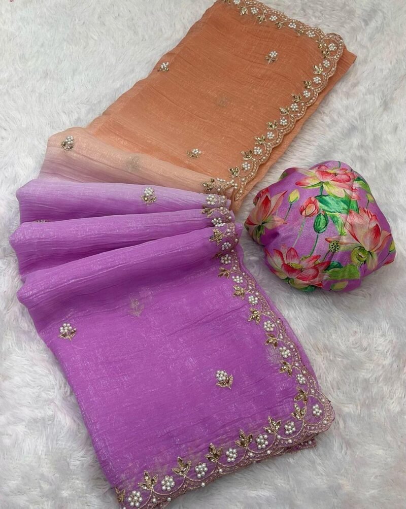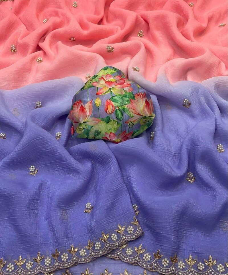 Fabric; Shaded crunchy chiffon saree flower Embroidered and Hand moti work with flower with floral digital printed Blouse piece.
